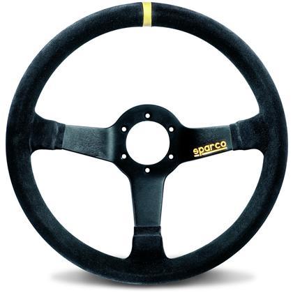 The Sparco R345 steering wheel is a 330mm diameter, 3 spoke flat steering wheel trimmed in black suede with a Sparco logo. It is a competition steering wheel designed for use in saloon racing or rally cars. Supplied with horn button.